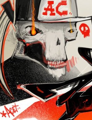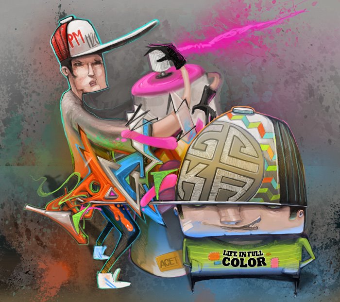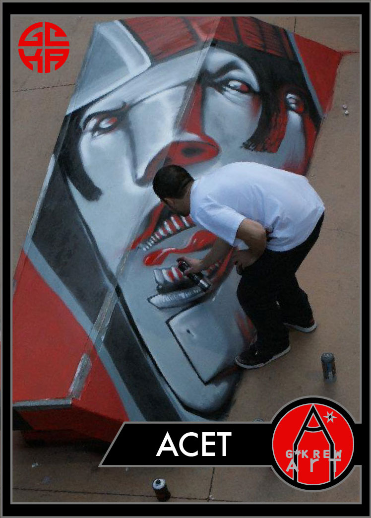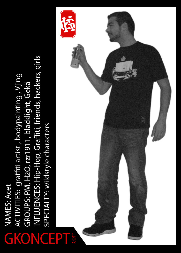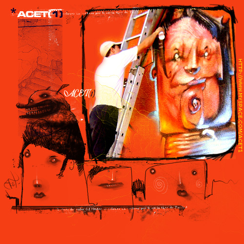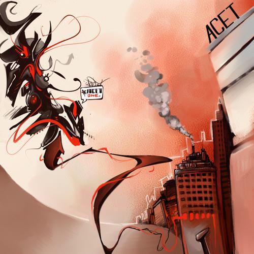 Acet construit son univers a base de personnages déformés et colorés par de vives lumières orange et des thèmes assez variés, mais toujours assez proche de l'esprit hiphop, la ville et les bboys.