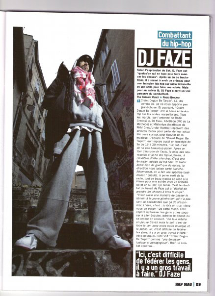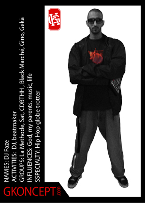 Faze est le dj de Sat l'Artificier, La Méthode, Gino, Black Marche et des soirées et émissions de radio Craint Degun Be Tarpin Hip Hop. Dj & beatmaker, son talent s'exprime et est validé sur toute la planète :France ,Belgique ,Suisse ,Allemagne ,Angleterre ,Canada, République Tchèque ,Macédoine ,Tunisie ,Maroc... Il est aujourd'hui un acteur incontournable de la scène hip hop et l'un des rares artistes français à avoir participé ou collaboré avec autant d'artistes internationaux : Dj Premier, Method Man, Redman, Pete Rock, Jazzy Jeff, Carl Cox, David Guetta ... La maîtrise de la culture hiphop, voire plus encore, au service du dancefloor.