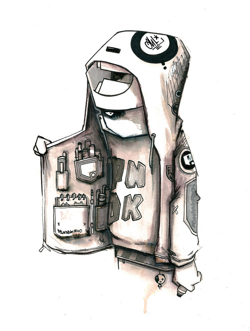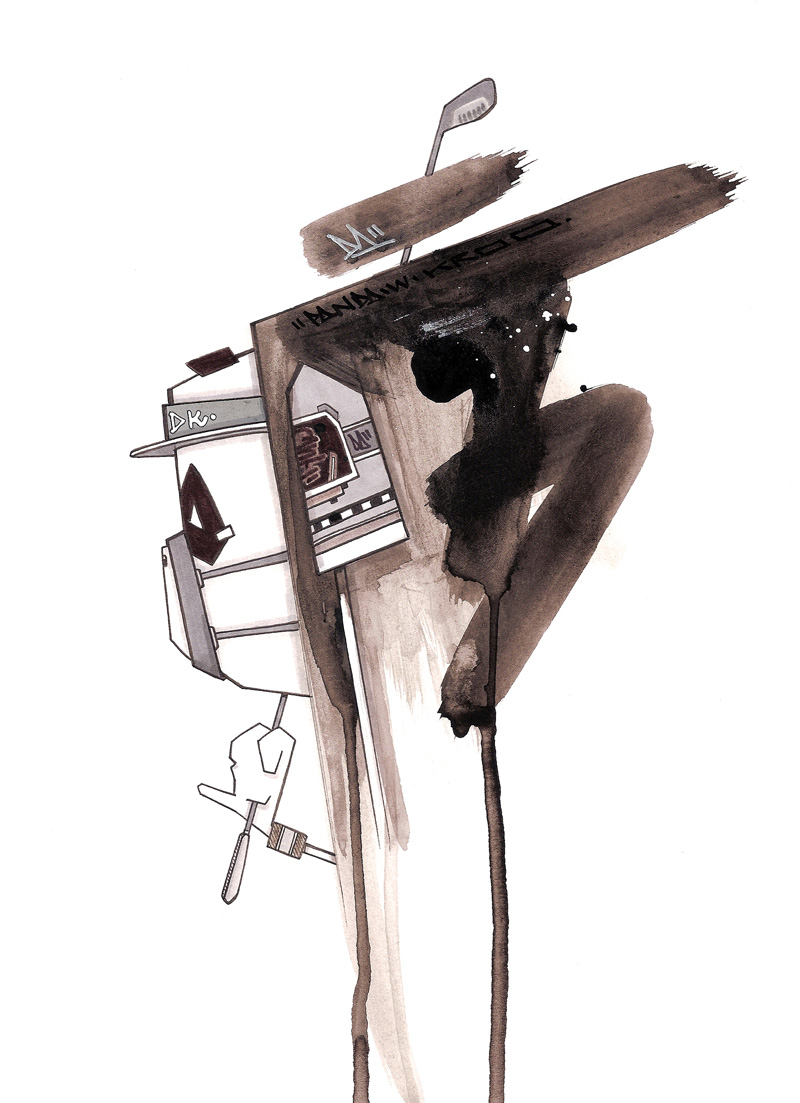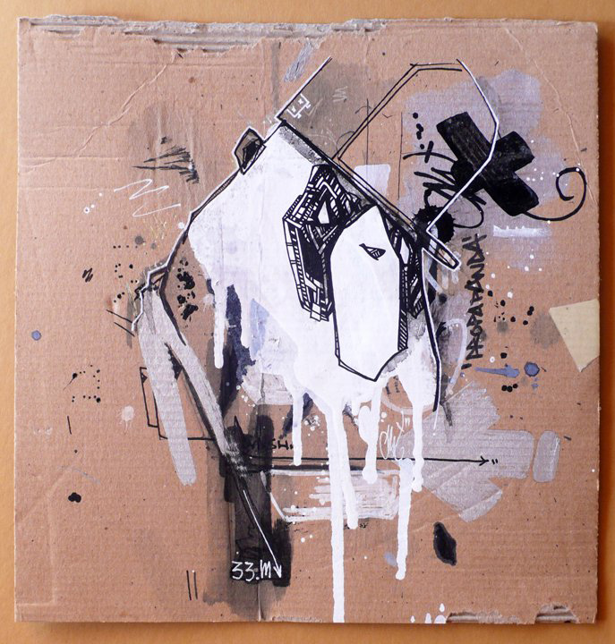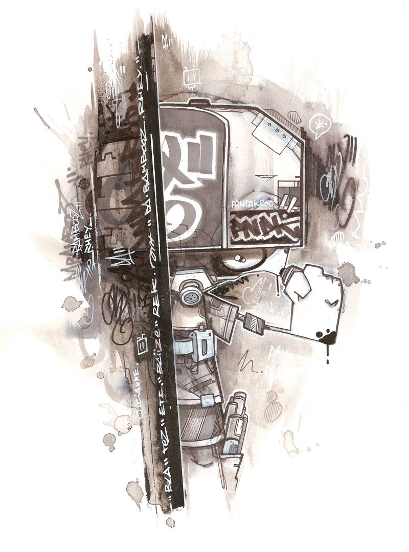 dans la rue surtout en noir et blanc, beaucoups de feutres, des encres et de la peinture.