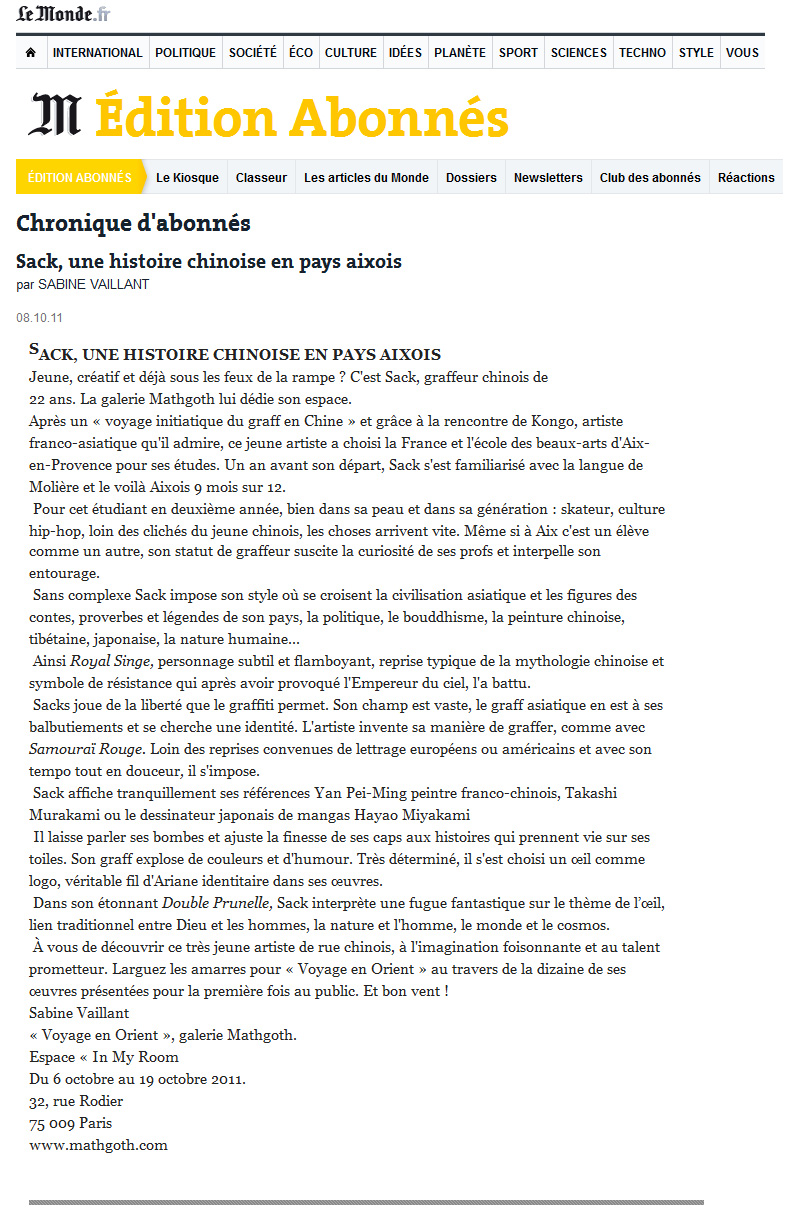 Ce graffiti-artiste/street artiste originaire de Cheng Du (Chine) a débuté la peinture en 2003. Il arrive en France en 2008, puis intègre ensuite les artistes représentés par la Galerie Mathgoth.