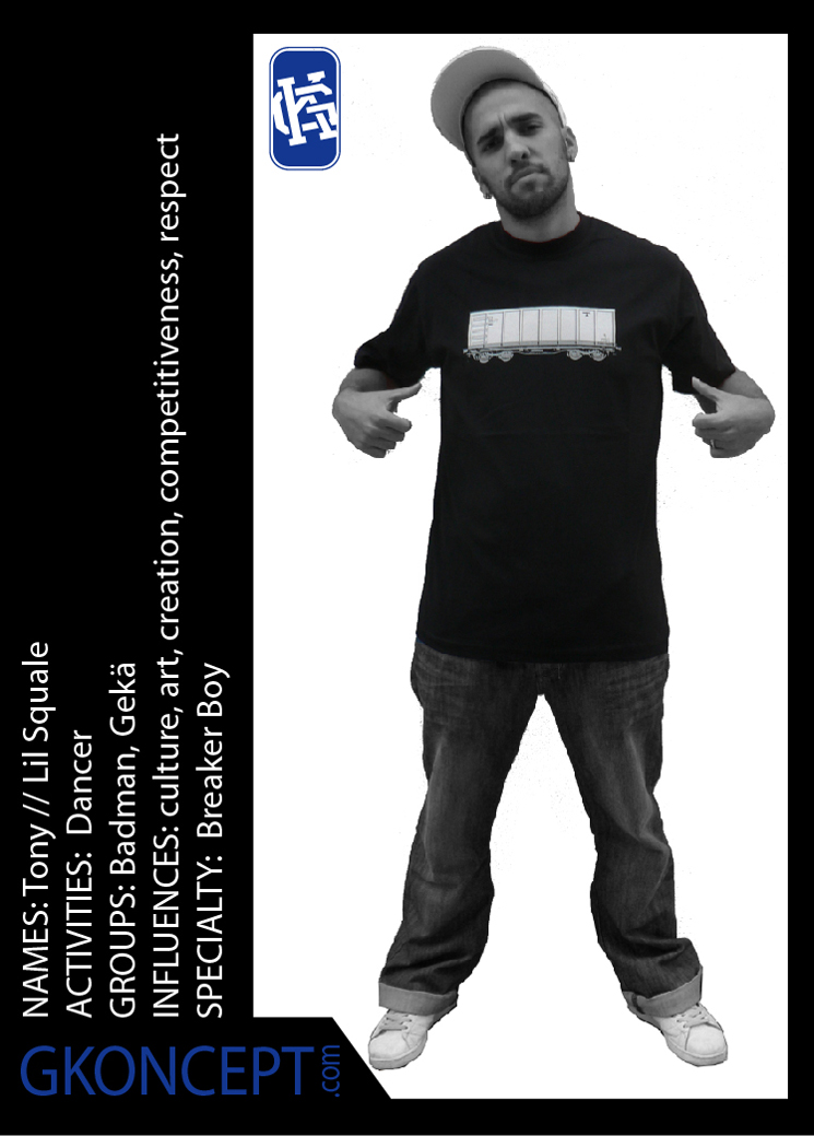 Tony a.k.a bboy lil'squale débuta la danse en 2003. Il créa le groupe "BADMAN" avec plusieurs danseurs spécialisés dans le break-dance et issus de divers horizons. Tony parcourt la France entière pour représenter sa ville et son art dans les battles. Mélangeant up'rock, top'rock, footwork et freez il est toujours à la recherche de nouveaux mouvements, d'originalité et créativité pour que son groupe et lui deviennent une des équipes les plus performantes.